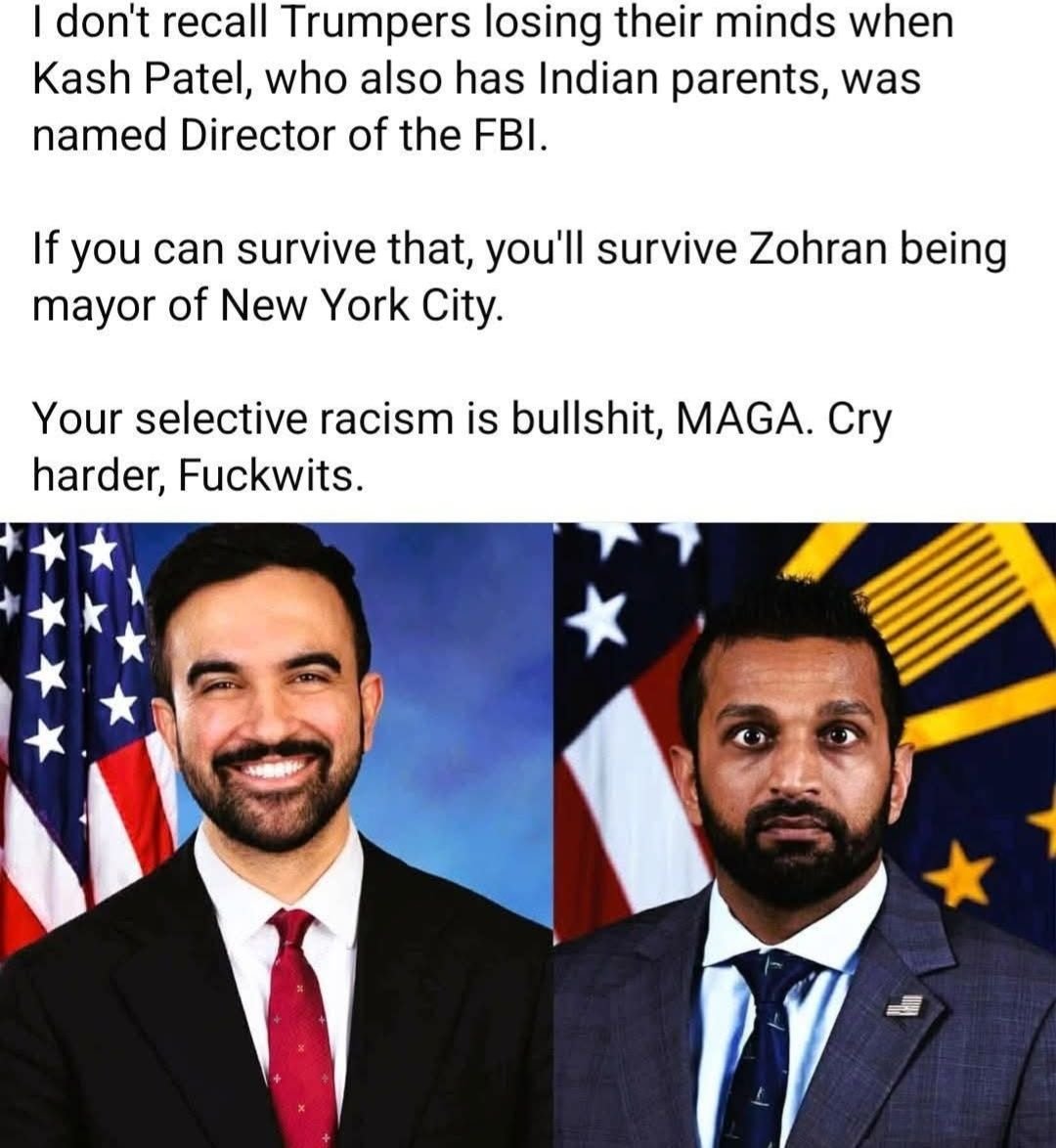 Does anyone recall MAGA losing their minds over Kash Patel being appointed as FBI Director? Yet their heads are blowing up over New York City Mayor-elect Mamdani.